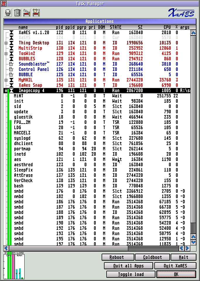 On Sat, 01 Oct 2011 20:31:14 , "Helmut Karlowski" <helmut.karlowski@ish.de> wrote: > Am 01.10.2011, 20:21 Uhr, schrieb Peter Slegg <p.slegg@scubadivers.co.uk>: > > > I had an ususual event with Samba a few weeks ago when connecting > > with a PC to the Milan. > > > > It is doing it again. The Task Mgr shows lots of smb tasks which > > the kill command doesn't kill but Task Mgr can kill them. > > The bar graphs are... well, have look. > > Funny :-) > > > Performance it terrible until I kill the processes off. > > Could you make the taskmanager bigger so the %-col and MiNT are visible? > Does this help ? Peter