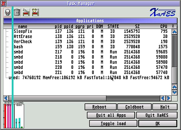 I had an ususual event with Samba a few weeks ago when connecting with a PC to the Milan. It is doing it again. The Task Mgr shows lots of smb tasks which the kill command doesn't kill but Task Mgr can kill them. The bar graphs are... well, have look. Performance it terrible until I kill the processes off. Peter