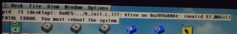 > >> failed to come up. I found that memory protection was on and, being a bad >> boy, I turned it off. > > Which simply hides the bug, as you know it. But I understand, one needs to > have a working system. And there's so many poorly coded applications out > Dammed... spoke too soon. Issue still there. Another one of them happened while using the Teradesk Viewer to see the xaaes.log file. Photo attached.
